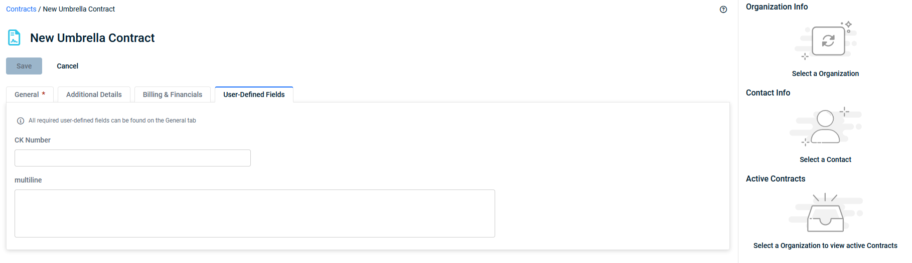 This tab lets you name the contract, link it to an organization and contact, set its start and end dates, and fill in any required custom fields. This tab must be complete before the contract can be saved.