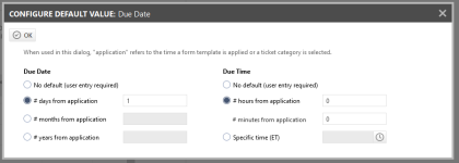 # hours | minutes from application | Select this radio button to set the Due Time to a specific number of hours, minutes, or hours and minutes from the time the form template or category was applied. Enter the number or hours, minutes, or both into the text fields. |