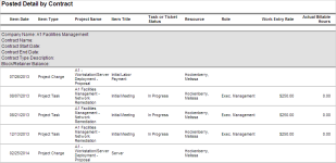 This report provides information on items posted in the system with a view by contract. The information includes task and ticket work, project and ticket charges, and milestones. The report provides a recap of work against the contract. |