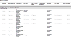 This report provides information on items posted in the system. The information includes task and ticket work, project and ticket charges, milestones, expenses, block/retainer purchases, ticket purchases, recurring services and subscriptions. The report can supplement invoices to display detailed information on work performed for a customer. |