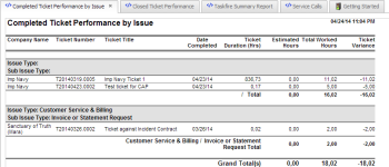 This report displays an issue type recap of completed tickets. The option to filter by date completed is available. |