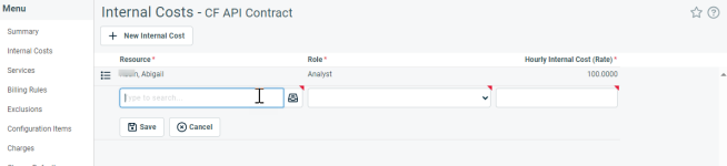 Contract Internal Costs allow you to set one or more internal costs specifically for work performed under a contract. The internal costs are assigned to individual resources and associated with a role. They are used in all profitability calculations for the contract.
