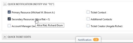 The name of the user who is filling the role is added to the role name. If more than one person is added, +# is added to the first name. If the ticket does not have a value for a role, the check box for that recipient will still be enabled, because they can still be selected on the Notification panel. Adding or changing a value for a recipient via the Quick Ticket Edits section will cause the names next to that check box to be added or changed accordingly.