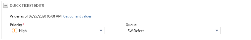 The current data is loaded when the section is first expanded. If the time entry dialog box is open for a long time, the Quick Edit fields can be changed by another user or a workflow rule. Click Get current values to update field values.