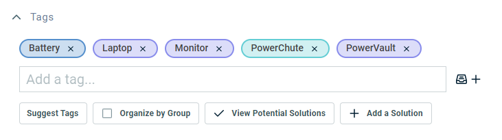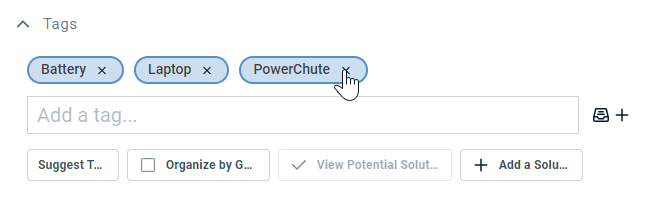 | View Potential Solutions | This button is enabled if at least one tag has been selected, and at least one article or document with a matching tag exists. When you click View Potential Solutions, the Suggested Solutions table will open to display knowledge base articles and documents that might help you to resolve the ticket. Only active articles and documents from the ticket's organization that share at least one tag with the ticket will be displayed. Articles and documents with the most matching tags will appear at the top. Refer to Finding a solution from a ticket. Click Knowledge Base > Search Knowledge Base to search the knowledge base anyway, even if no matching tags were found. Refer to Searching and managing Knowledge Base articles. |