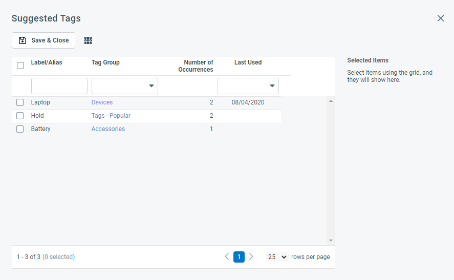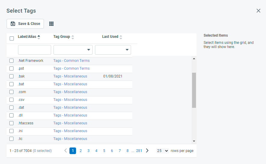 Search for tags by name, tag group, or the date the tag was last used. Select one or more tags and click Save & Close to add them.
