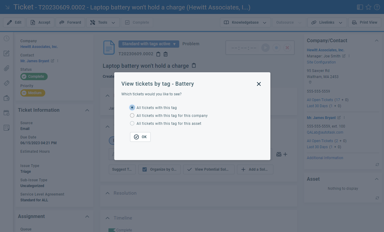 When you click a tag on a ticket, you can choose to search for other tickets with that tag. Your choices are the following: