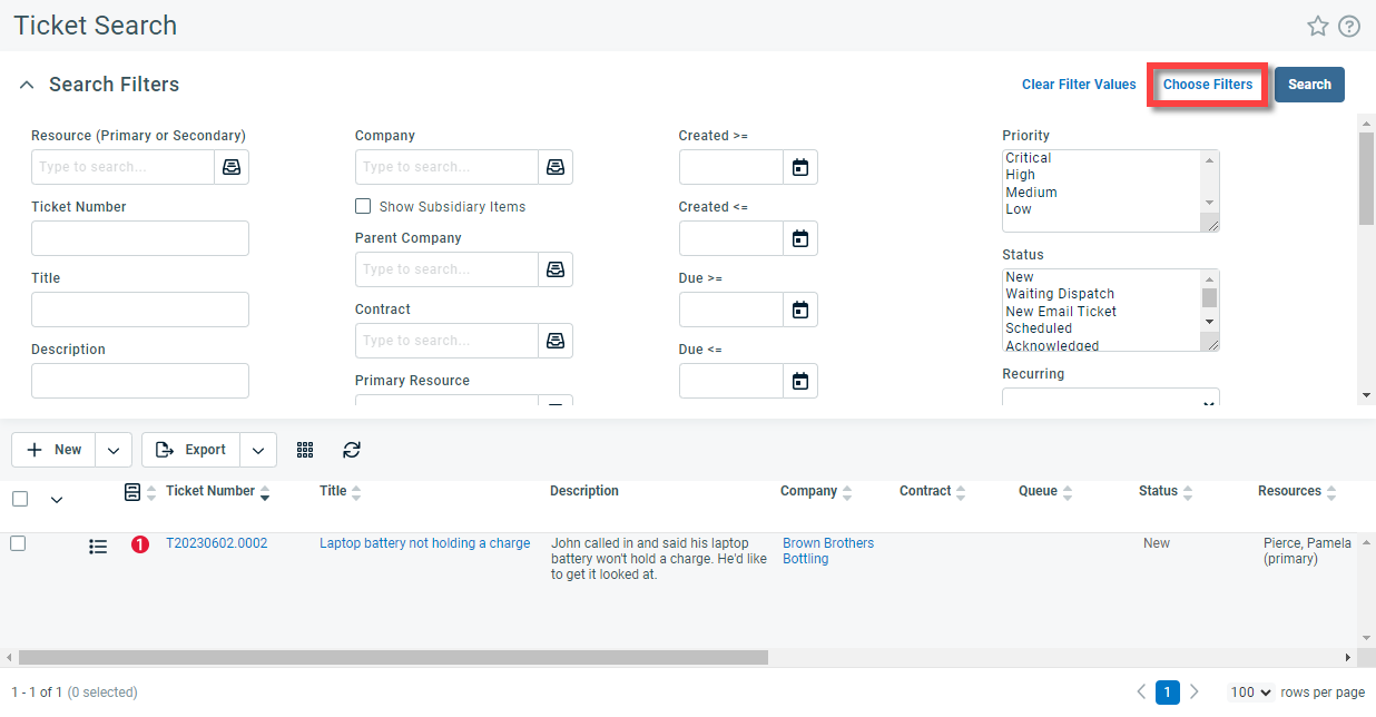 If you don't see these options on the search page, you can click the Choose Filters button in the Search Filters section of the Ticket Search page and add them from the available inventory.