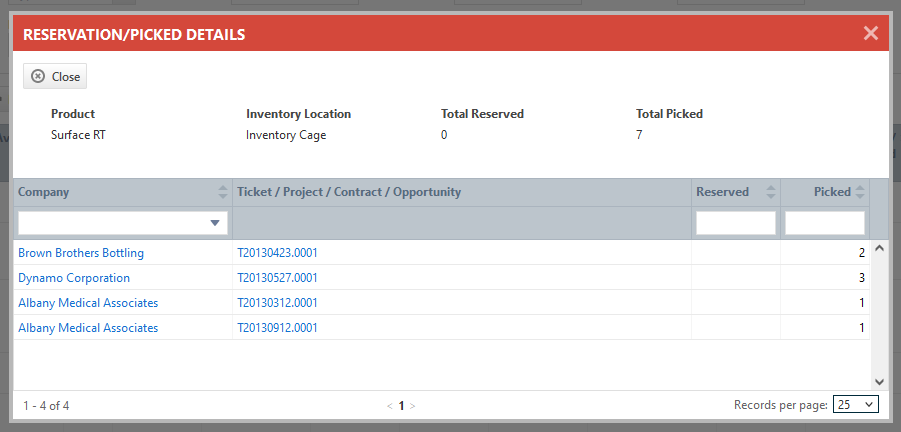| Reserved, Picked | The number of items picked or reserved for the specified ticket, opportunity, contract, or project. |