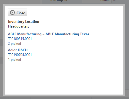When a window or table displays the number of stocked items that were reserved on a quote or picked for a charge, you can click on the number to view details about the items reserved or picked.