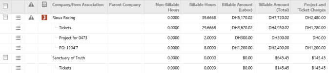 - Billing item grouping rows: Grouping rows exist in three sub-varieties. These are Tickets, Project, and Purchase Order. They represent more granular subsets of billing items that belong to each of those organizations.