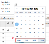 The Item Date is the date worked for labor items and the transaction dates for other types of billable items, including labor adjustments. The default date range is greater than or equal to the current day minus 30 days. You can extend the date range to a maximum of 2 years. NOTE If you apply an Organization filter, the date range limit is extended to two years prior to the current date and ten years after the current date. Any labor adjustments made during the specified date range will be included in the search result. The original billing item for those adjustments will also be included if the item has not yet been invoiced. Note that the date of the original billing item may fall outside of the specified date range. If you click the calendar item next to the Item Date filters, you can apply date shortcuts. The same shortcuts are available on the Posted Date filters. |