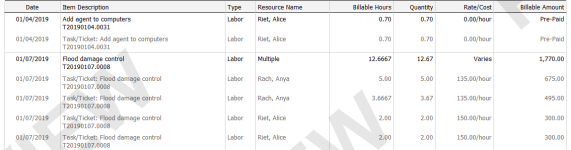 EXAMPLE For example, the invoice preview below shows two billing items, each for a different ticket. The display lists details for the one labor item included in billing item 1 and the four labor items rolled into billing item 2.