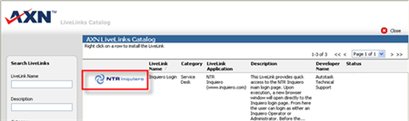Users with access to the LiveLinks Designer can browse the AXN Catalog. It lists all available LiveLinks created by Autotask or a member of its user community. Users with Install LiveLinks permission can download and install LiveLinks from the catalog.