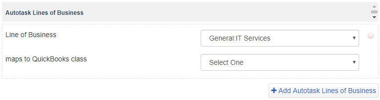1. Click +Add Autotask Lines of Business and select a line of business from the drop-down menu. You can add up to 10 lines of business to filter by and map to a class.