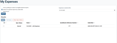The My Expenses page is dedicated to manually searching for one or multiple expense reports for the purpose of syncing or re-syncing, if necessary.